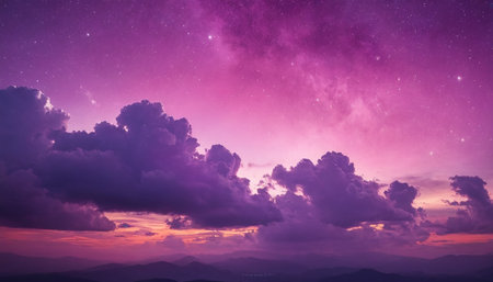 Vivid purple night sky with glowing clouds and scattered stars, tranquil atmosphere and cosmic celestial backdrop.