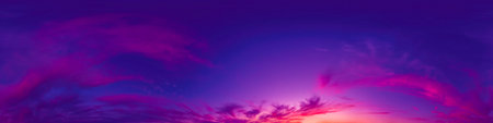 Blue sky panorama with magenta Cirrus clouds in Seamless spherical equirectangular format. Climate and weather change.