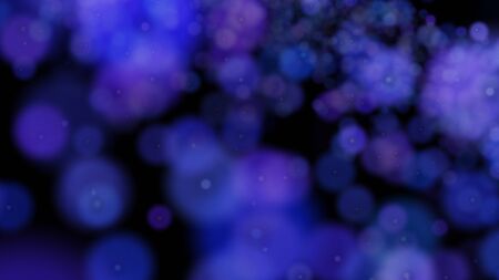Defocused bokeh lights on black background, an abstract naturally blurred backdrop for Valentines Day or birthday party. Festive light texture. Violet blue garland in blur. Color 2022