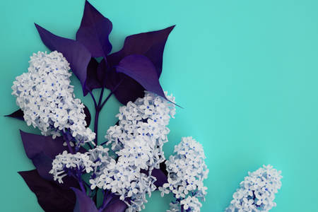 A sprig of white lilac tinted in purple. Trending colors natural floral background. Lush flowers with leaves on a turquoise background top view. Copy space.