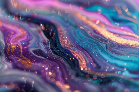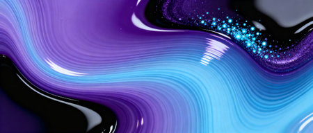 Vivid abstract purple and blue fluid pattern with shimmering sparkle effects and smooth glossy swirling gradient lines.