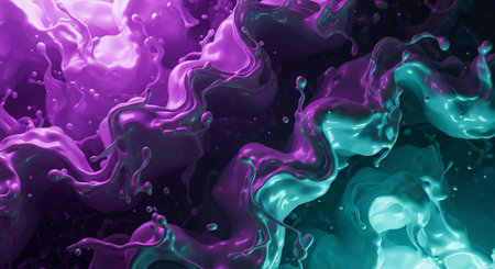 A vibrant and energetic abstract capturing dynamic splashes of liquid frozen in mid-air. The fluid forms are rendered in striking shades of purple and teal, with highlights and shadows emphasizing their curves and textures. The overall impression is one of intense motion and artistic expression, with droplets and waves creating an intricate, organic pattern.