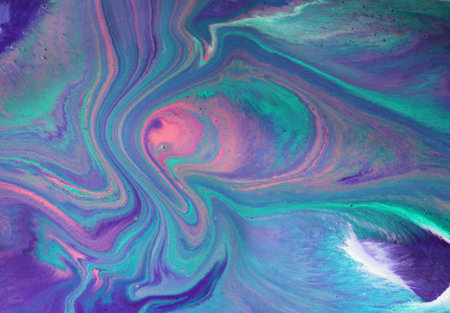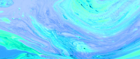 Epoxy resin paint with turquoise, purple and white colors. Liquid background with splashes and ripples. Modern abstract texture with alcohol inks. Vibrant colors mixes on macrophotography picture.