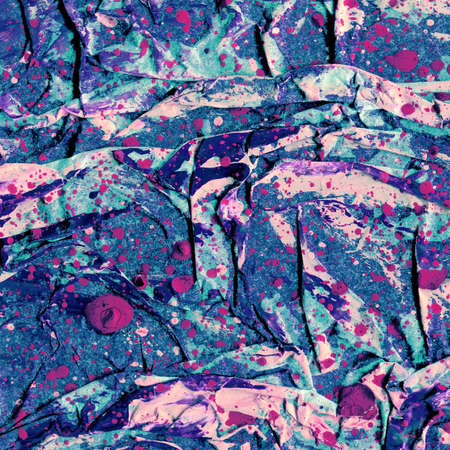 Contemporary abstract art illustration. Wrinkled paper texture paint drops. Colorful background expressive impressionist modern painting banner postcard poster. Bright grungy colored paper texture.