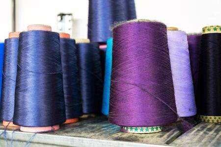 Colorful thread reels set up for sewing machine, textile industry factory concept