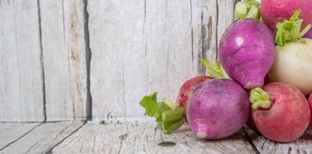 Fresh red turnip on wooden background- garden vegetable