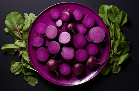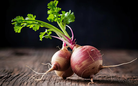 A captivating close-up of fresh purple daikon radishes with vibrant green leaves, showcasing their rich colors and organic appeal on a dark background.