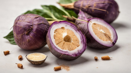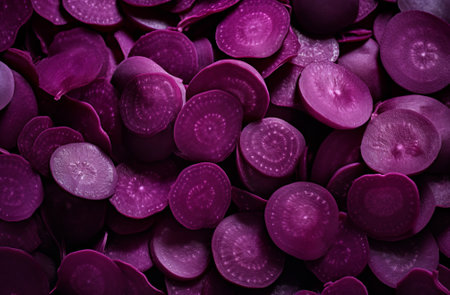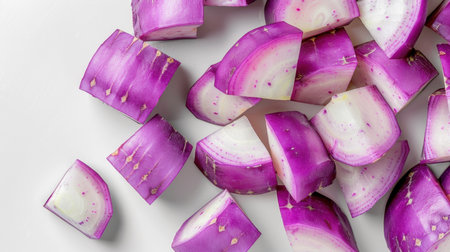 Vibrant purple radishes are freshly sliced and beautifully arranged on a clean white surface, showcasing their unique colors and textures, perfect for healthy cooking.