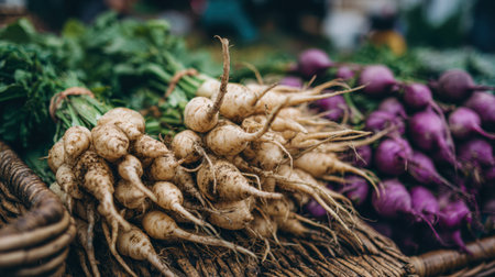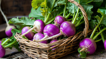 A beautiful arrangement of freshly harvested purple turnips with vibrant green tops nestled in a rustic woven basket, showcasing the freshness of farm produce.