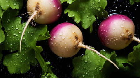 Fresh turnips with water drops background. Vegetables backdrop. Generative AI.