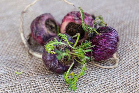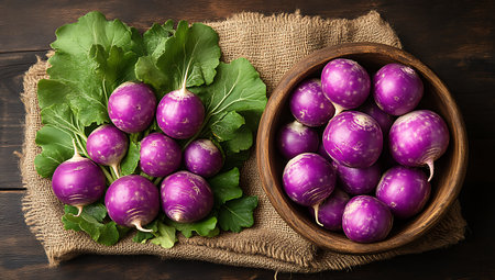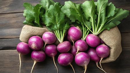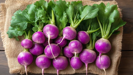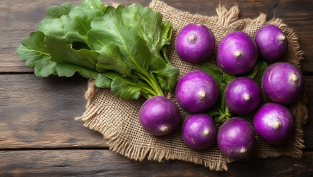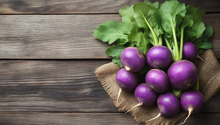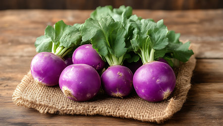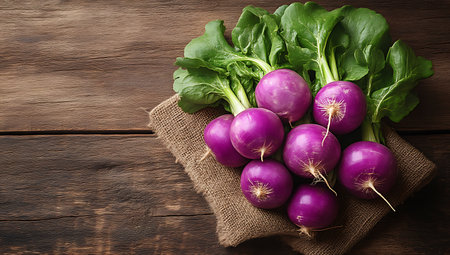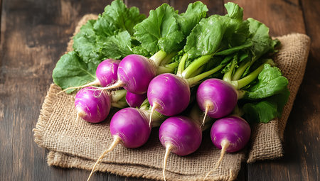 Fresh showing fresh purple turnips with green leaves arranged on burlap sack on rustic wooden table. resolution use. Clear details and vibrant colors enhance visual appeal. Fresh, purple, turnips.