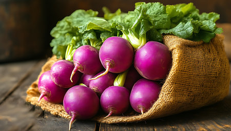 Fresh showing fresh purple radishes with green leaves in a burlap sack on dark wooden surface. resolution use. Clear details and vibrant colors enhance visual appeal. Fresh, purple, radishes.