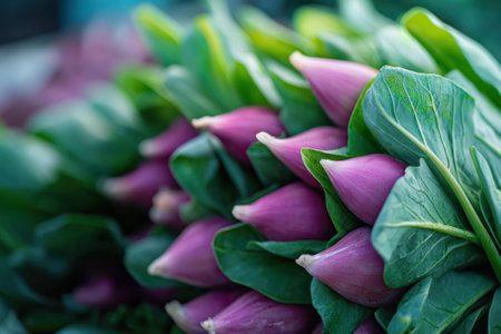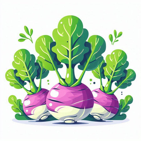 Vibrant purple radishes with lush green leaves, freshly harvested and ready for culinary use. Perfect for healthy meals or farm market themes.