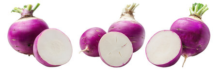 Fresh red turnip with green leaves and sliced pieces isolated on white transparent background. Concept of healthy organic vegetables, nutrition, and farming