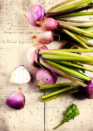 Grunge graffiti effect image of raw baby purple turnips ideal for your bistro or restaurant wall art or menu cover design art. Generous accommodation for copy space.