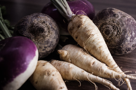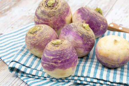 Closeup of raw organic turnips on rustic wooden background