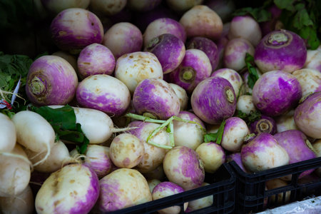 Turnip roots displayed for sale at greengrocery