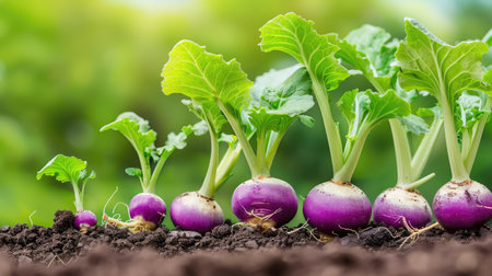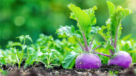 A close-up view of fresh purple turnips growing in rich, dark soil showcases their vibrant colors against a lush green background, symbolizing health.