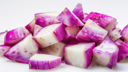This image showcases freshly chopped purple vegetable pieces, highlighting their vibrant colors and textures. Perfect for food photography and culinary presentations.