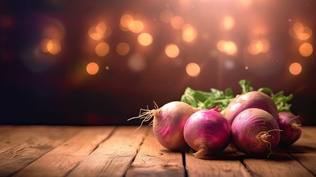 Fresh showing fresh purple radishes with green leaves arranged on rustic wooden table in natural light. resolution use. Clear details and vibrant colors enhance visual appeal. Fresh, purple, radishes.