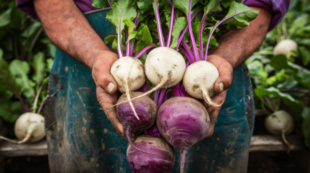 farmer holding purple beets and white turnips generative ai