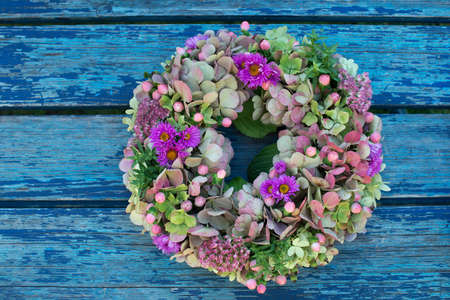 Colorful blossom wreath on blue wooden background