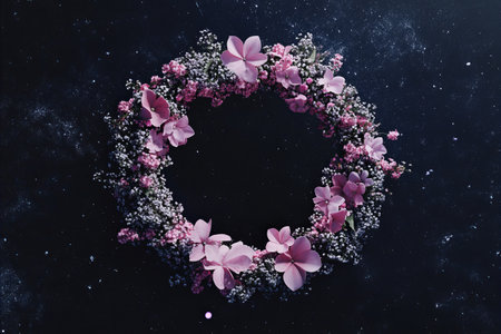 A stunning wreath made from purple bougainvillea petals showcases its vibrant beauty against a dark background, perfect for enhancing home decor or events.
