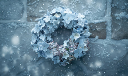Pale blue hydrangea wreath on frozen background