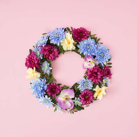 Spring floral round wreath full of fresh colorful flowers and leaves. Creative flat lay concept on pastel pink background.