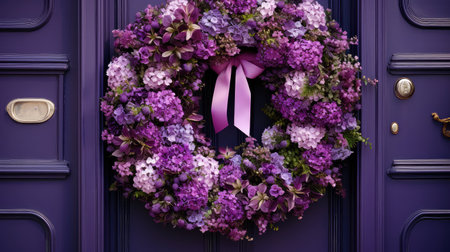 Luxury Festive Wreath in Purple and Gold, Hanging on Elegant Dark Blue Door, Holiday Decoration