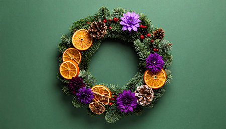 Christmas wreath with purple flowers, orange slices and pine cones on green background