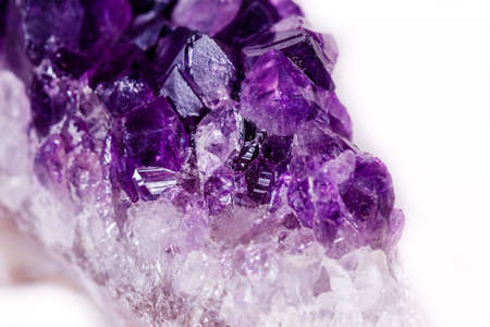 Macro Mineral Stone Amethysts in the rock on a white background close up