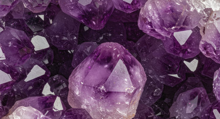 Close-up of natural amethyst crystals with shimmering purple hues, creating a textured abstract background perfect for use as copy space in design.