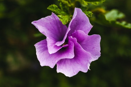 Australian native hibiscus Alyogyne huegelii with purple flowers outdoor in sunny backyard shot at shallow depth of field