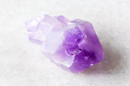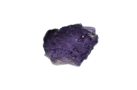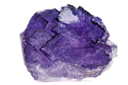 sample of unworked purple striped fluorite mineral on white marble background close up