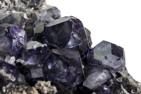 Macro purple cubical fluorite crystal cluster isolated on black background