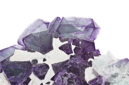 Macro mineral stone purple amethyst in crystals on a white background close up