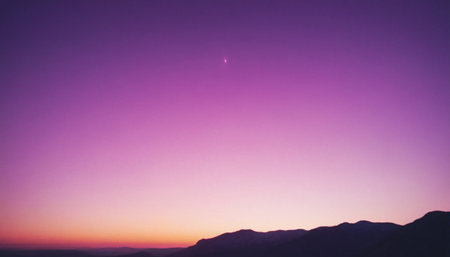 A smooth gradient transitions from deep purple to soft pink in a hazy sky. Clear details and vibr...