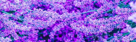 Purple flowers in the meadow. Spring landscape. Panoramic image.