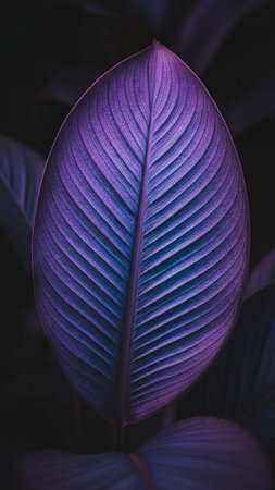 A detailed macro shot of a large, deep purple leaf showcasing its prominent parallel veins and textured surface against a dark, out-of-focus natural backdrop.