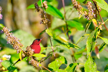 A male crimson sunbird is perching on a branch of East India screw tree and making calls.