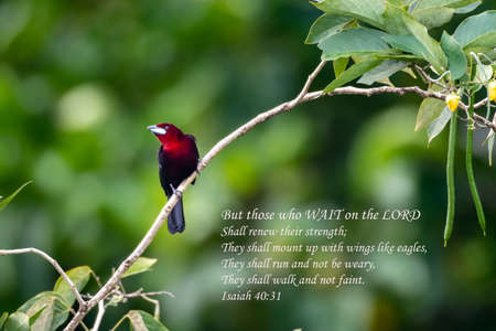 Red bird perched in the forest with and encouraging and inspirational Bible Verse quotation about waiting and strength.