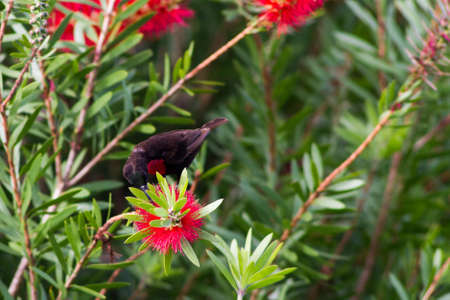 Scarlet-chested sunbird on a flower, Namibia, Africa