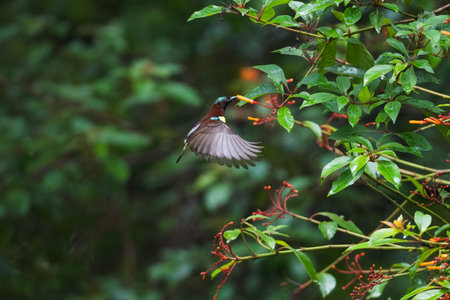 Green-tailed sunbird (Aethopyga nipalensis angkanensis) subspecies found on the summit of Inthanon national park, Thailand (soft focus from fog on the summit)