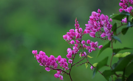 Beautiful pink colored Bougainvillea vine flowers with vine and leaves. Used selective focus.
