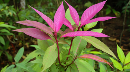 Soft pink and white leaves of tropical plants create a dreamy, surreal garden texture