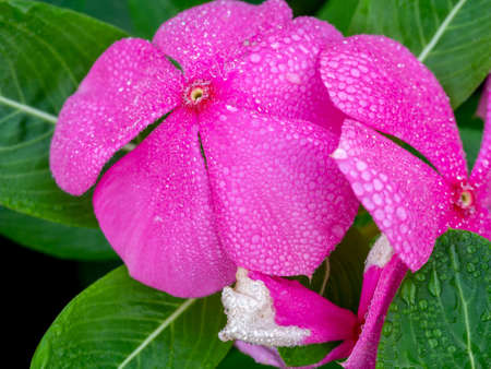 Hundreds of Water Drops All over The Pink Rose Periwinkle in The Garden