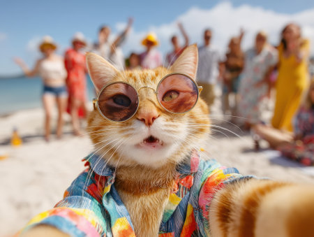 Orange cat in sunglasses takes a selfie on a beach with people in the background, wearing a colorful shirt, with a playful expression, surrounded by a sunny, cheerful atmosphere