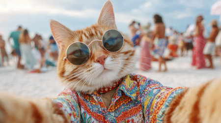 Orange cat wearing round sunglasses and a colorful shirt takes a playful selfie at a vibrant beach party, with people mingling in the background, under a partly cloudy sky