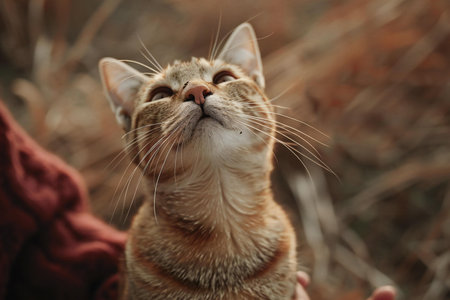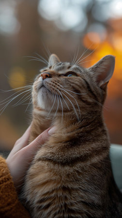 tabby shorthair cat getting stroked by female hand outdoors in the autumn forest